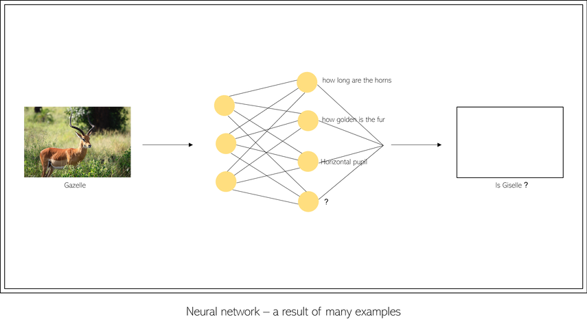 Neural networks, much hyped in recent years, are special in a sense that they make the same decisions, as the email algorithm, but they also learn by which properties to decide. Lets look at an algorithm that decides whether some image is an image of a gazelle – it trains on thousands of labeled images – an image accompanied by a caption “yes” if the image is in fact that of a gazelle and “no” otherwise – and changes its parameters until it can generalize to new, unlabeled images. A well-trained model has extracted features that are existing in all of that images it was given as input – how long are the horns, how golden is the fur, and so on.